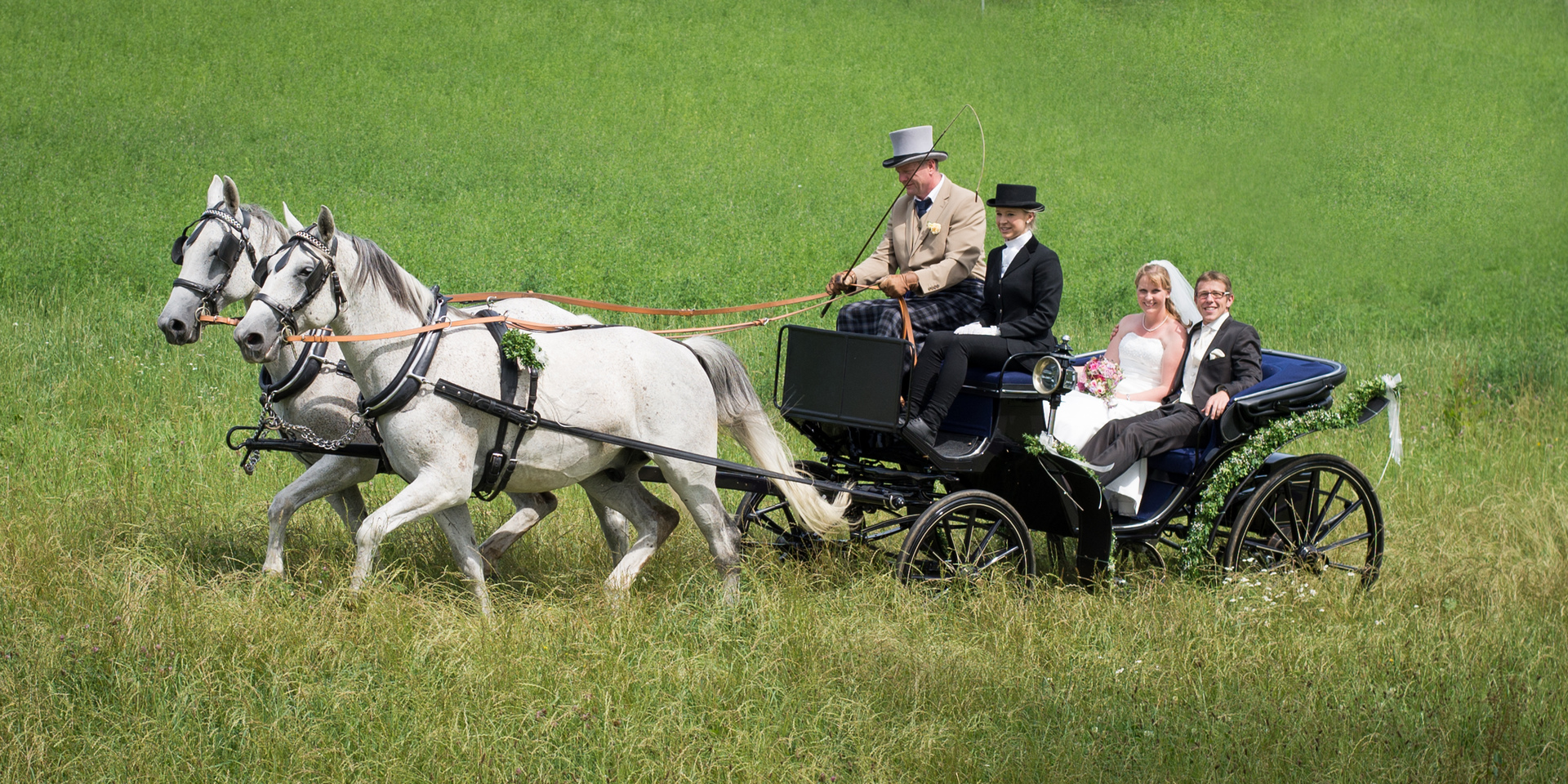 Kutscher und Beifahrer in schickem, ganz dem Anlass entsprechendem Outfit vervollständigen das Traumbild.